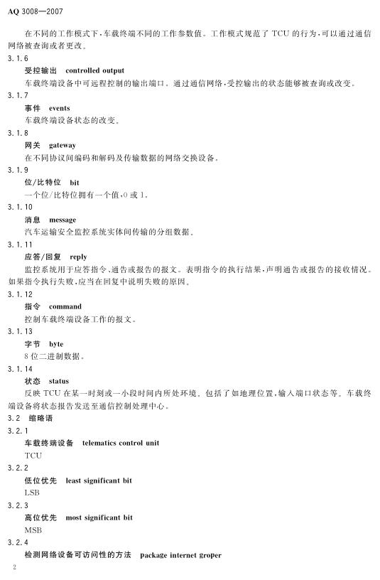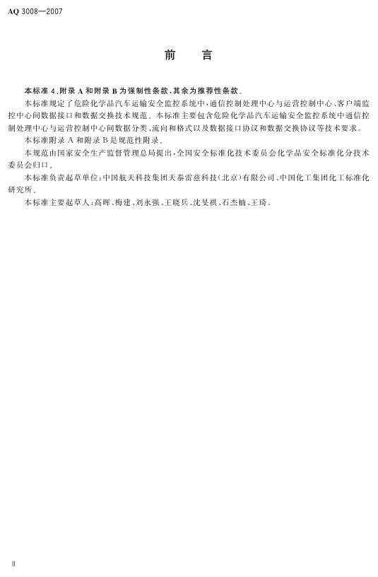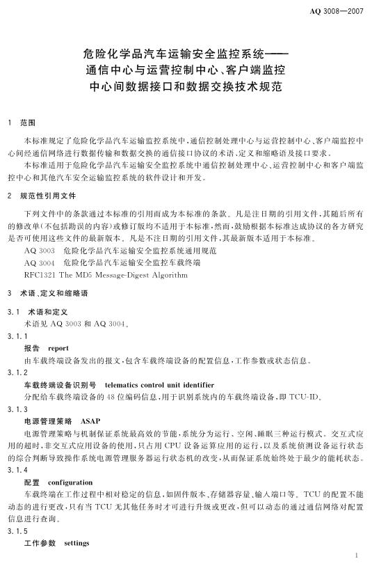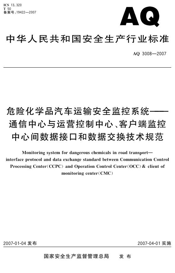 AQ 3008-2007 危险化学品汽车运输安全监控系统 通信中心与运营控制中心、客户端监控中心间数据接口和数据交换技术规范