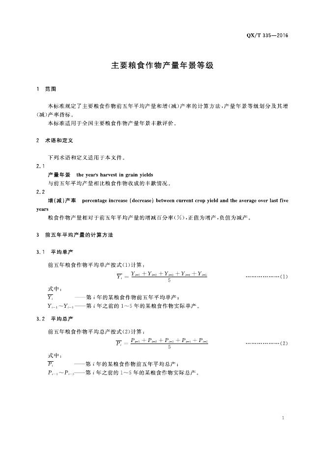 QX/T 335-2016 主要粮食作物产量年景等级
