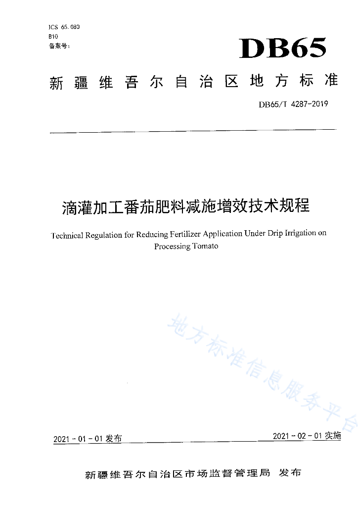 DB65/T 4287-2019 滴灌加工番茄肥料减施增效技术规程