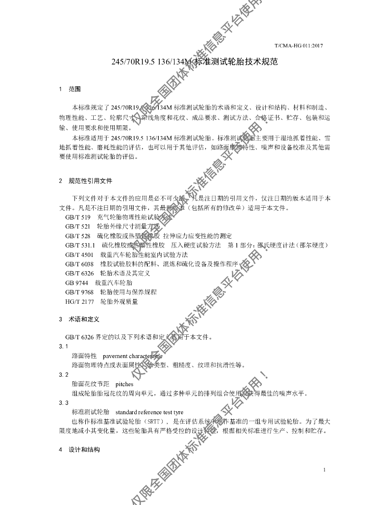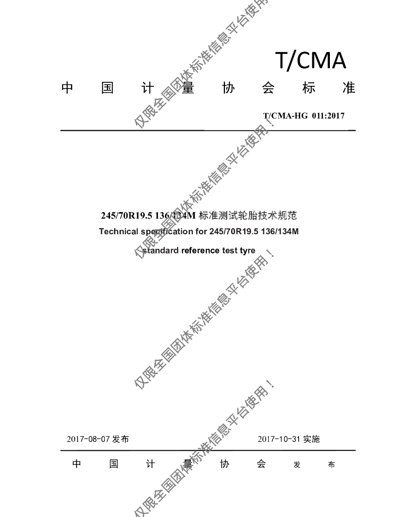 T/CMA-HG 011:2017 245/70R19.5 136/134M标准测试轮胎技术规范