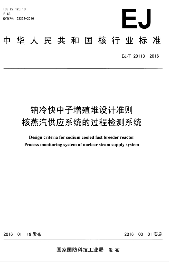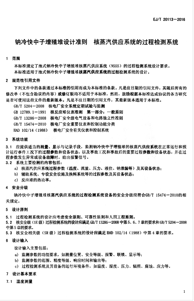 EJ/T 20113-2016 钠冷快中子增殖堆设计准则 核蒸汽供应系统的过程检测系统