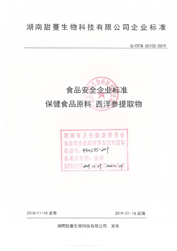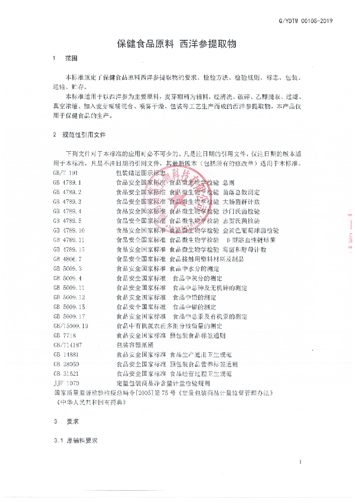 Q/YDTM 0010S-2019 保健食品原料 西洋参提取物