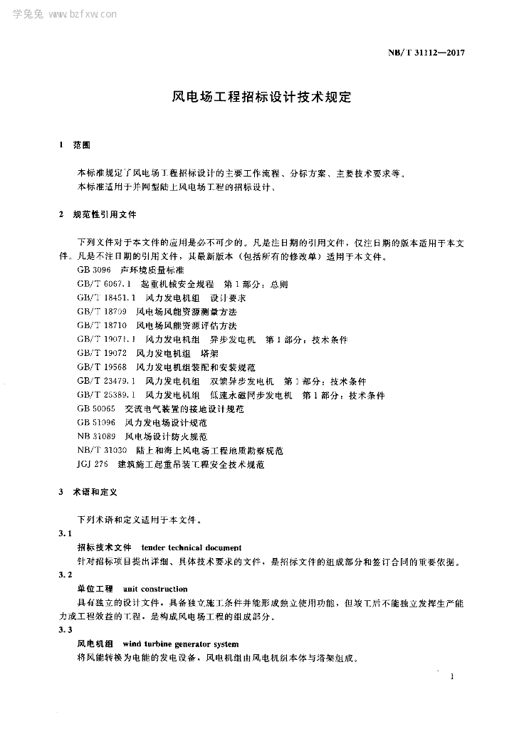 NB/T 31112-2017 风电场工程招标设计技术规定