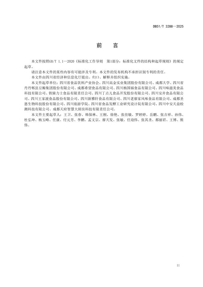 四川省食品饮料产业协会、四川高金实业集团股份有限公司、成都大学、四川省丹丹郫县豆瓣集团股份有限公司、成都希望食品有限公司、四川杨国福食品有限公司、四川味滋美食品科技有限公司、铁骑力士食品有限责任公司、四川丁点儿食品开发股份有限公司、四川安井食品有限公司、四川王家渡食品股份有限公司、四川新雅轩食品有限公司、四川老廖家风味食品有限公司、成都圣恩生物科技股份有限公司、四川旅游学院、四川省食品发酵工业研究设计院有限公司、四川中安天益检测科技有限公司、成都天府智慧大厨房科技有限责任公司