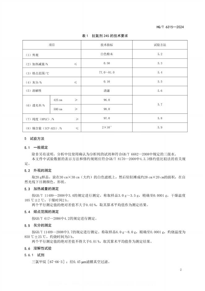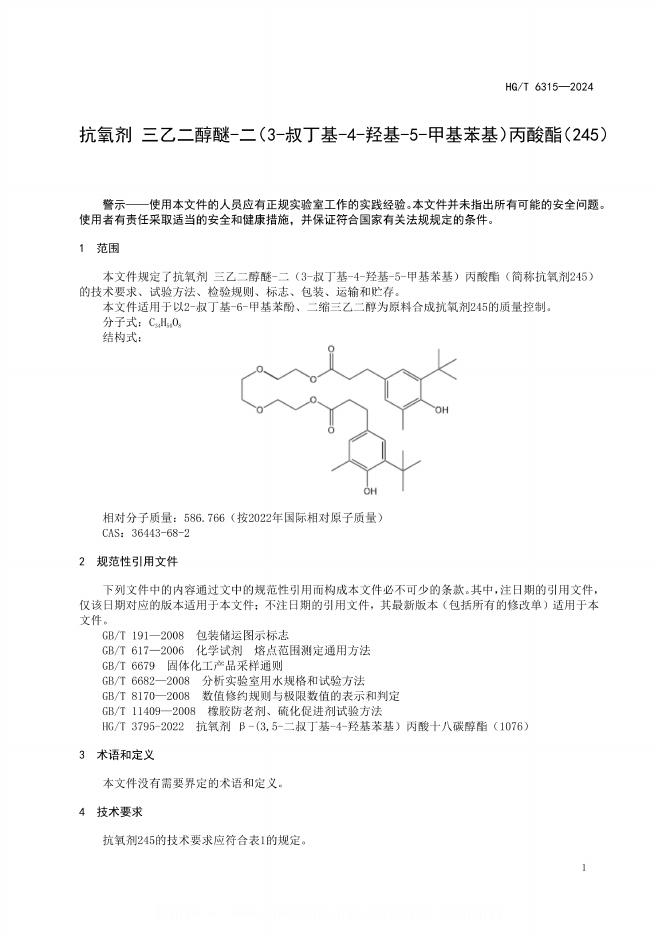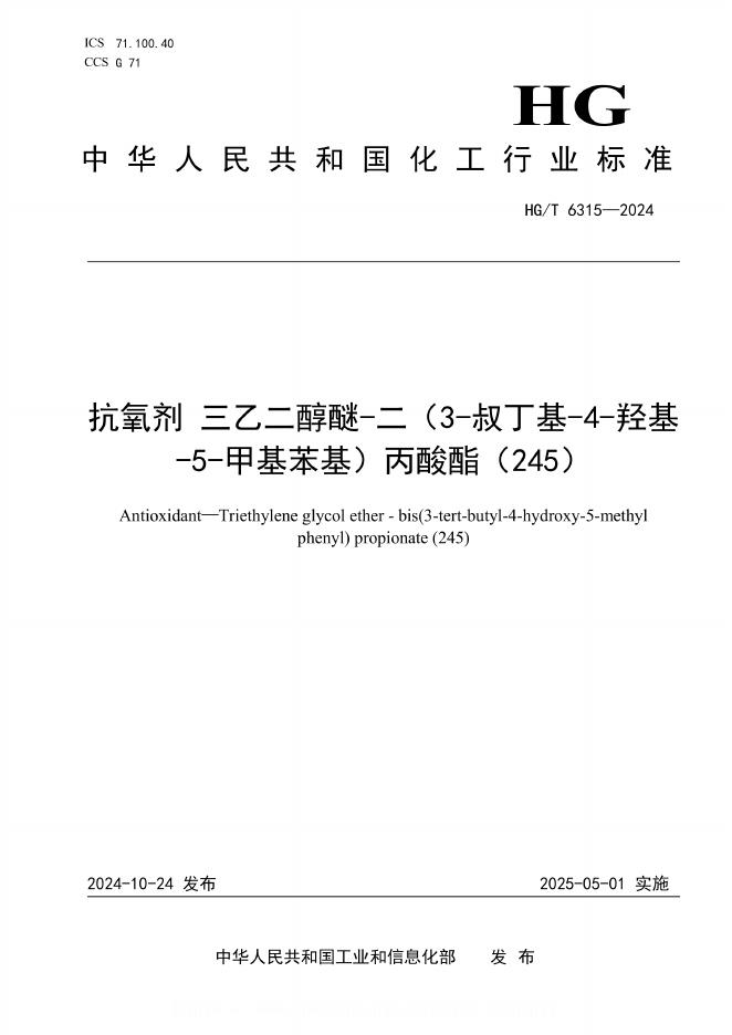 HG/T 6315-2024 抗氧剂 三乙二醇醚-二(3-叔丁基-4-羟基-5-甲基苯基)丙酸酯(245)