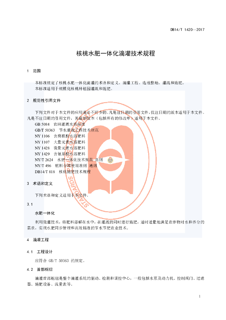 DB14/T 1420-2017 核桃水肥一体化滴灌技术规程