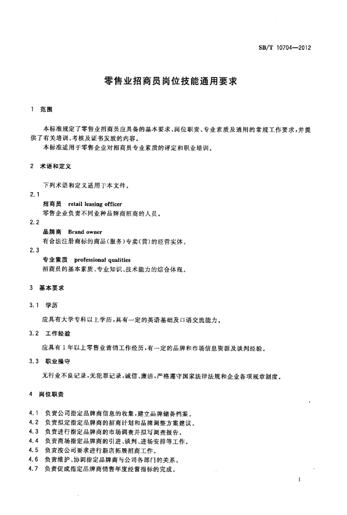 SB/T 10704-2012 零售业招商员岗位技能通用要求