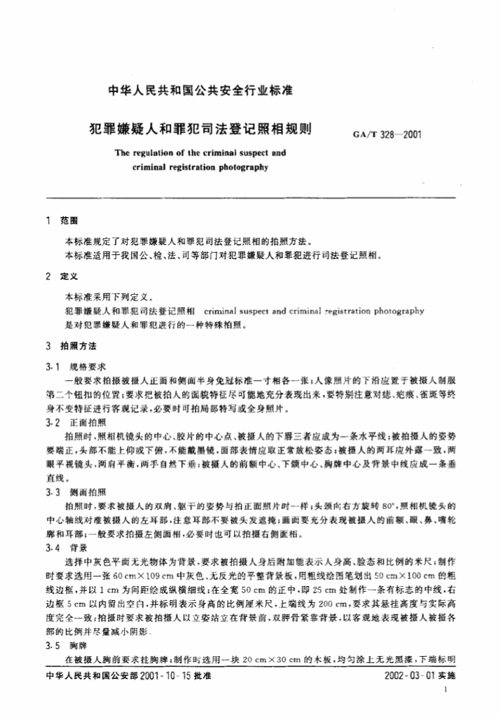 GA/T 328-2001 犯罪嫌疑人和罪犯司法登记照相规则