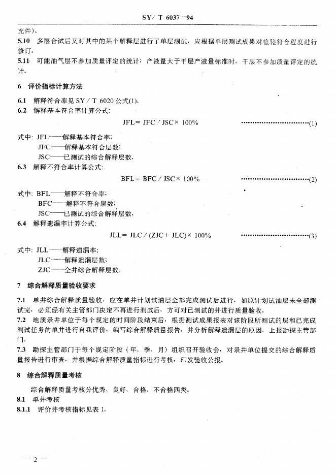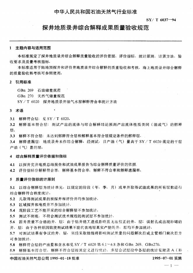 SY/T 6037-1994 探井地质录井综合解释成果质量验收规范