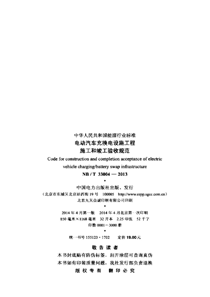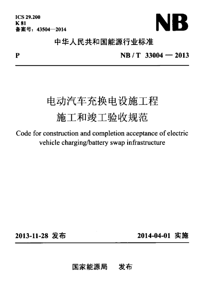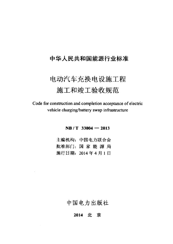 NB/T 33004-2013 电动汽车充换电设施工程施工和竣工验收规范