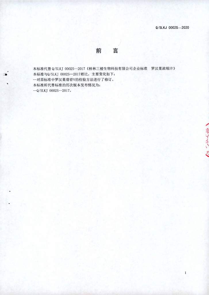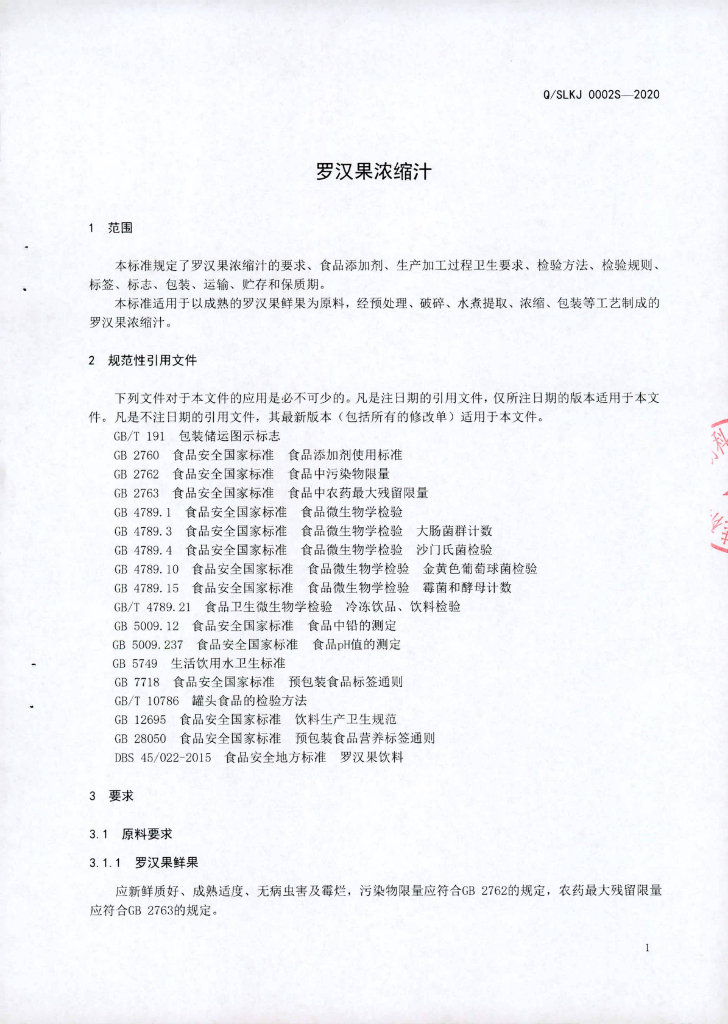 Q/SLKJ 0002S-2020 罗汉果浓缩汁