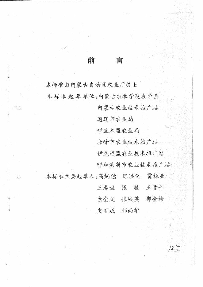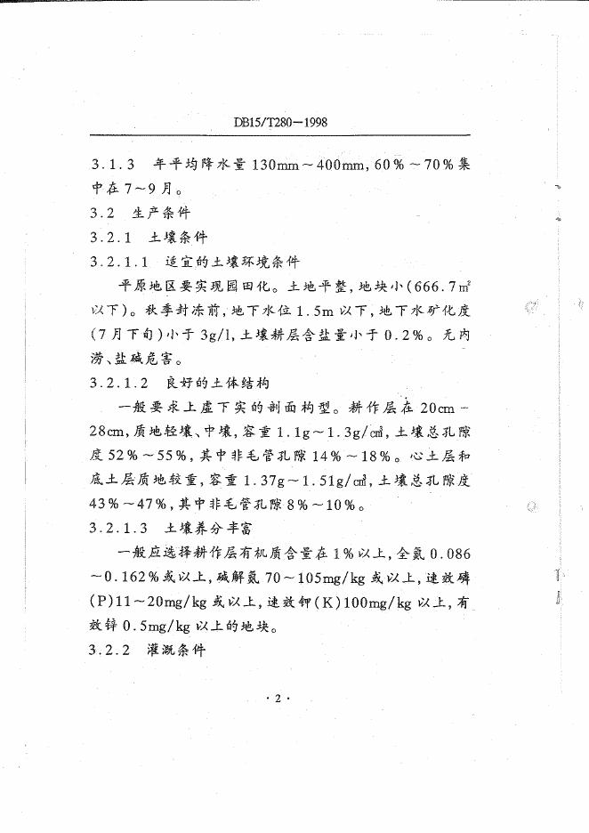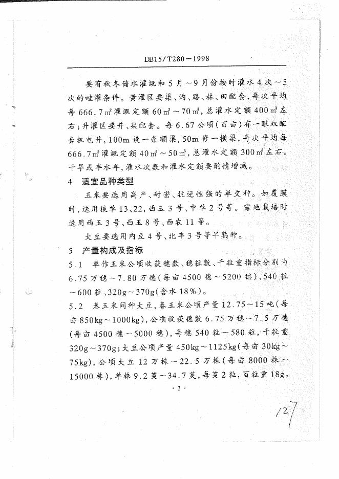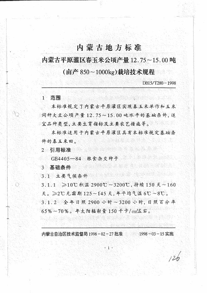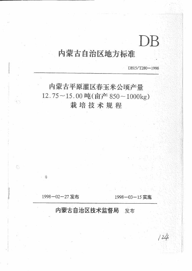 DB15/T 280-1998 内蒙古平原灌区春玉米公顷产量12.75-15.00吨(亩产850-1000kg)栽培技术规程
