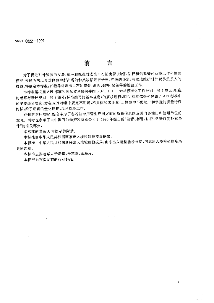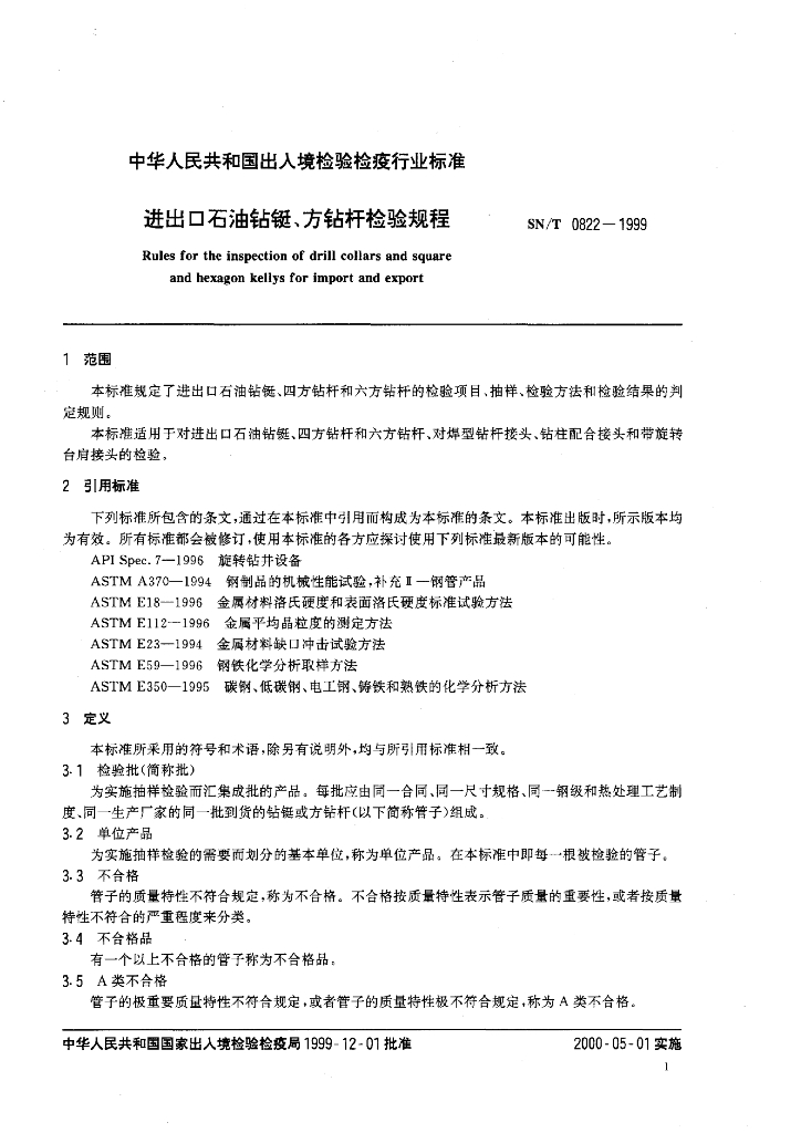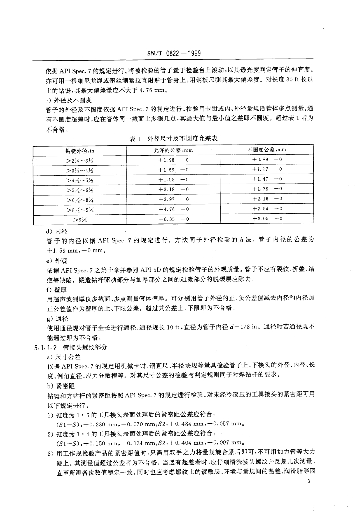 SN/T 0822-1999 进出口石油钻铤、方钻杆检验规程