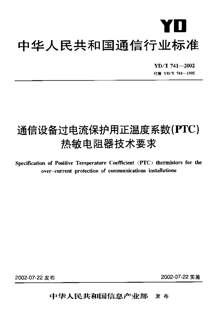 YD/T 741-2002 通信设备过电流保护用正温度系数(PTC)热敏电阻器技术要求