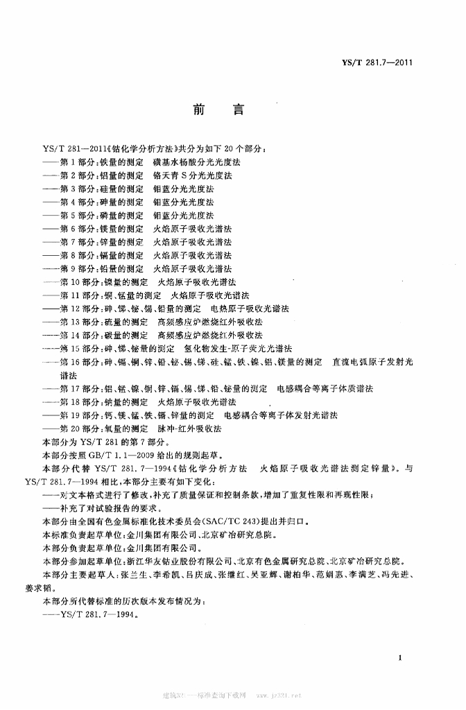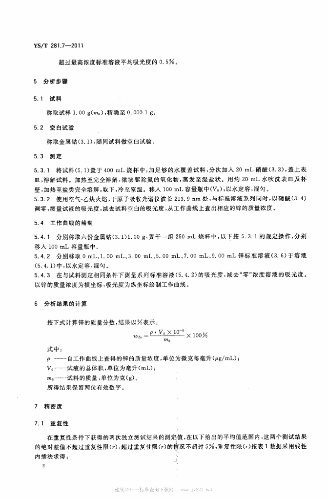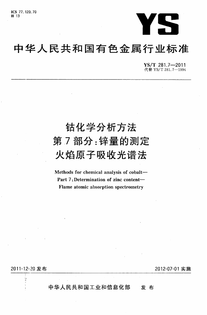 YS/T 281.7-2011 钴化学分析方法 第7部分:锌量的测定火焰原子吸收光谱法