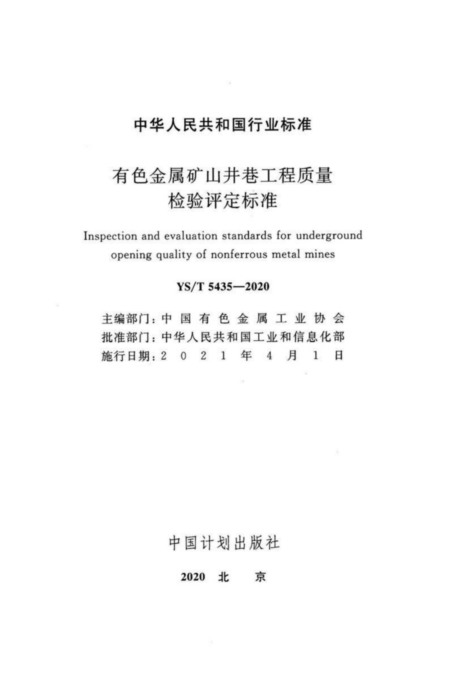 YS/T 5435-2020 有色金属矿山井巷工程质量检验评定标准