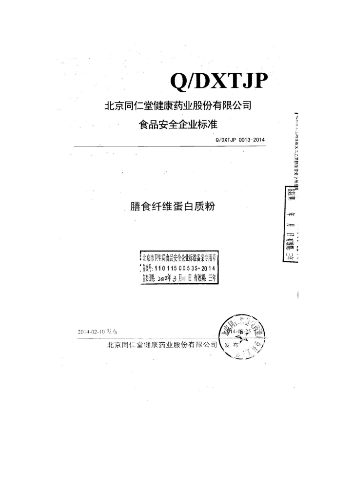 Q/DXTJP 0013-2014 北京同仁堂健康药业股份有限公司 膳食纤维蛋白质粉