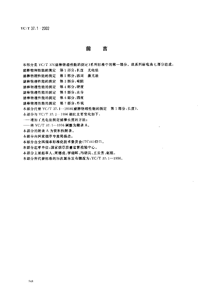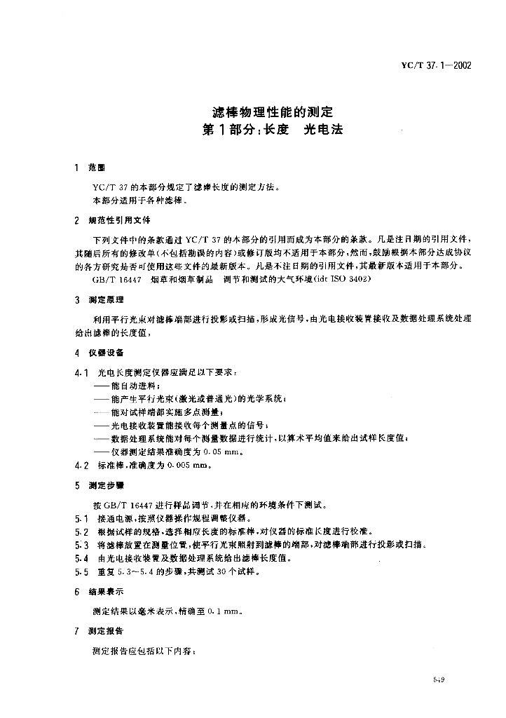 YC/T 37.1-2002 滤棒物理性能的测定 第1部分:长度 光电法