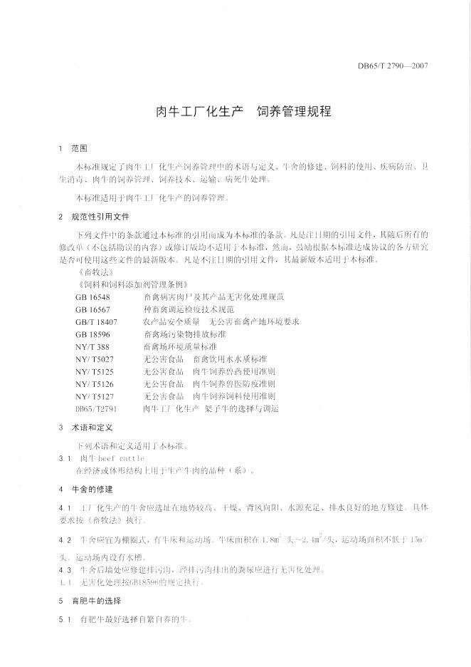 DB65/T 2790-2007 肉牛工厂化生产 饲养管理规程