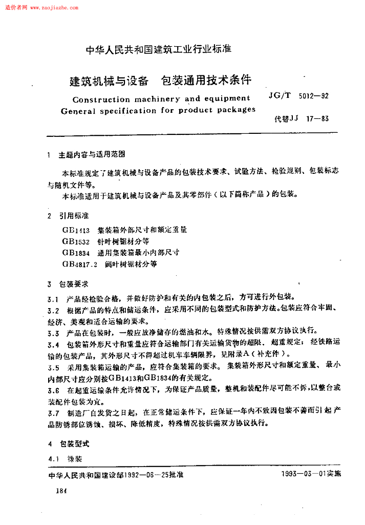 JG/T 5012-1992 建筑机械与设备包装通用技术条件规范
