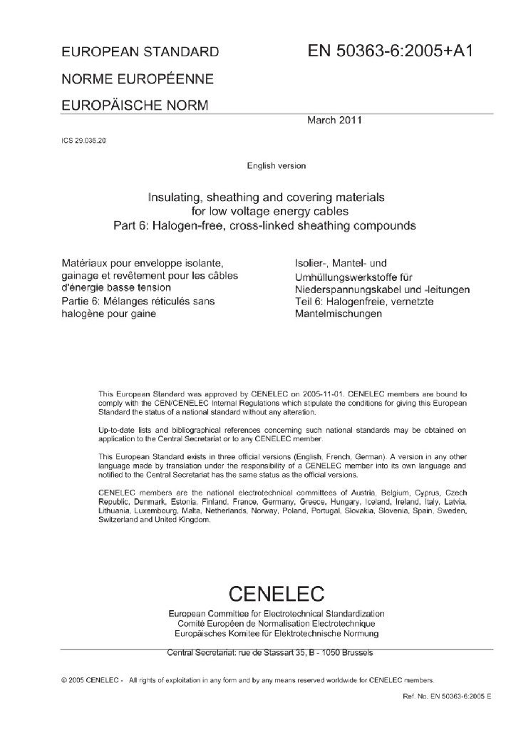 BS EN 50363-6:2005+A1:2011 低压电力电缆绝缘,护套和内衬材料-第6部分 无卤,交联护套化合物