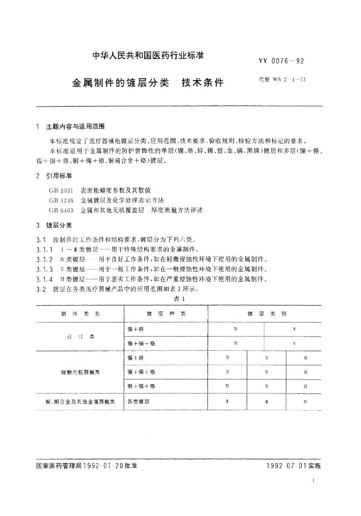 YY/T 0076-1992 金属制件的镀层分类 技术条件