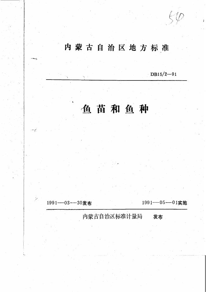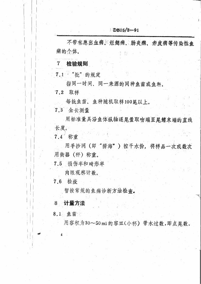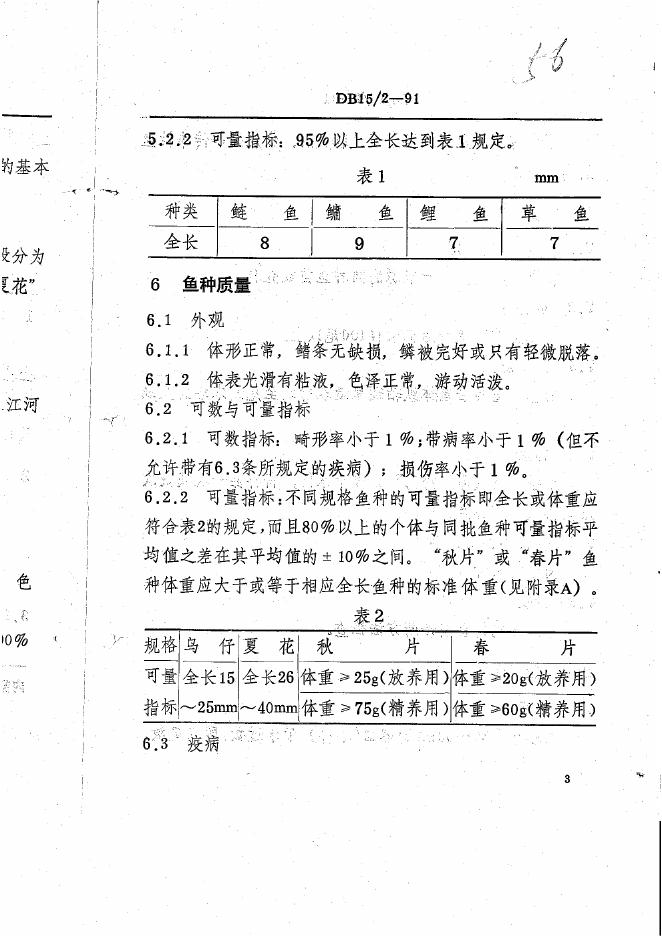 DB15/ 2-1991 内蒙古主要养殖鱼类 鱼苗和鱼种质量标准