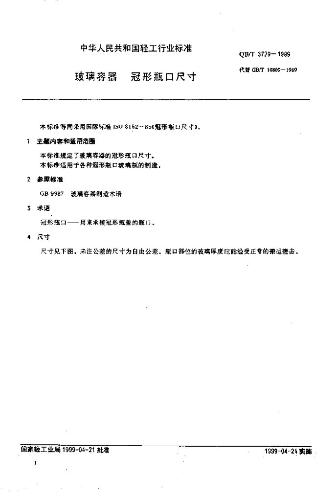 QB/T 3729-1999 玻璃容器冠形瓶口尺寸