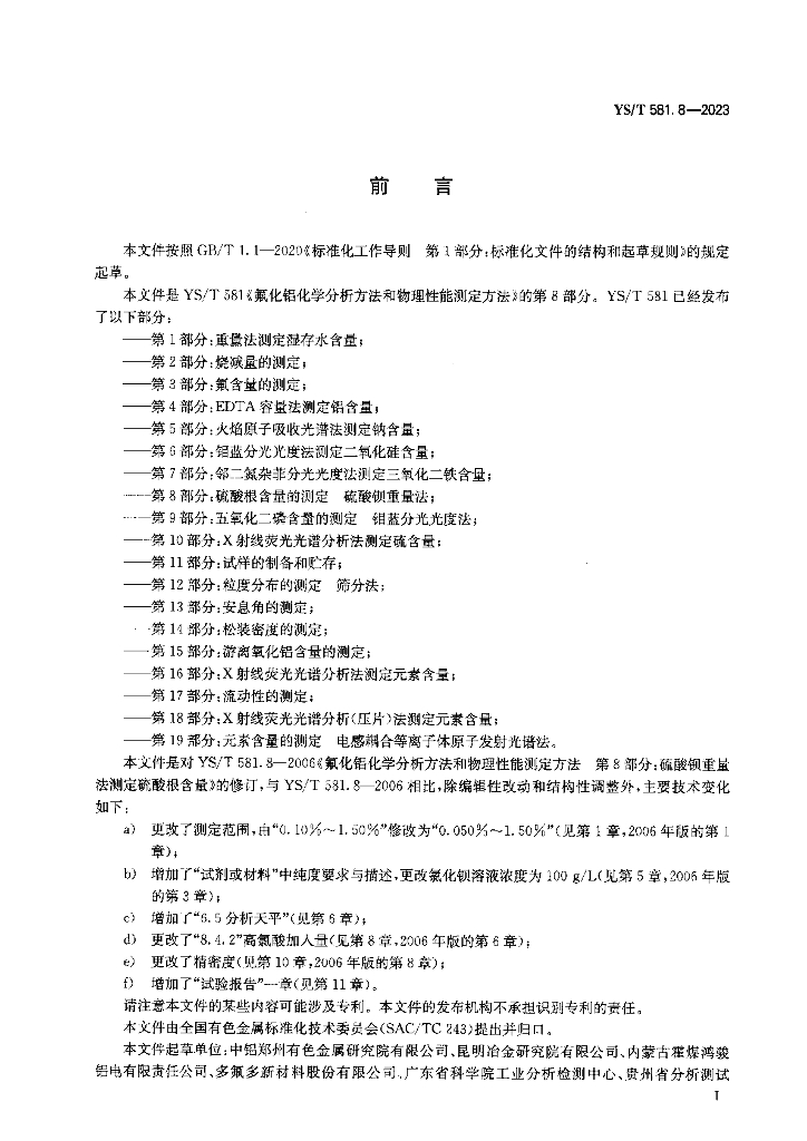 YS/T 581.8-2023 氟化铝化学分析方法和物理性能测定方法 第8部分:硫酸根含量的测定 硫酸钡重量法