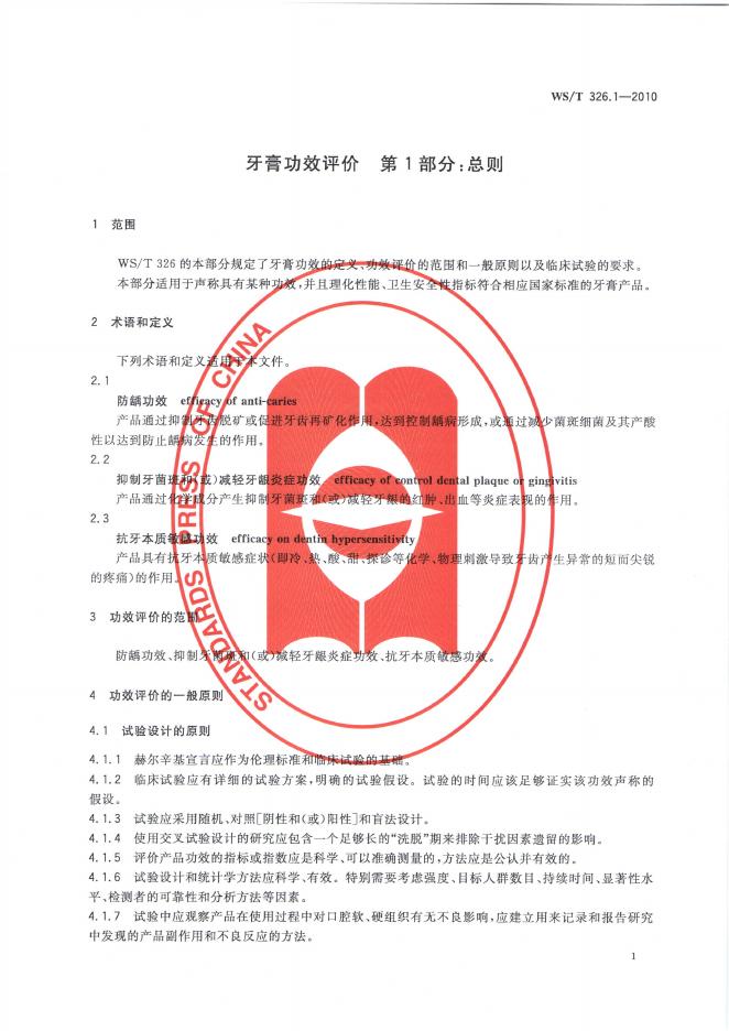 WS/T 326.1-2010 牙膏功效评价 第1部分:总则