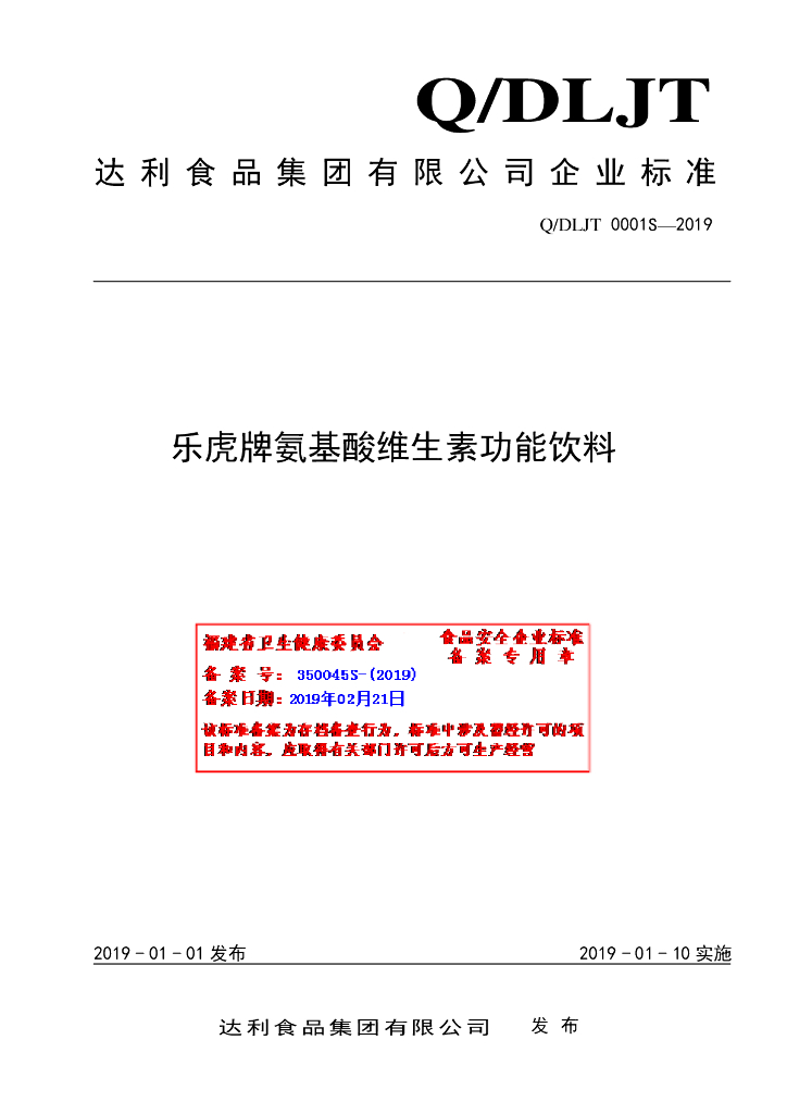 Q/DLJT 0001S-2019 乐虎牌氨基酸维生素功能饮料