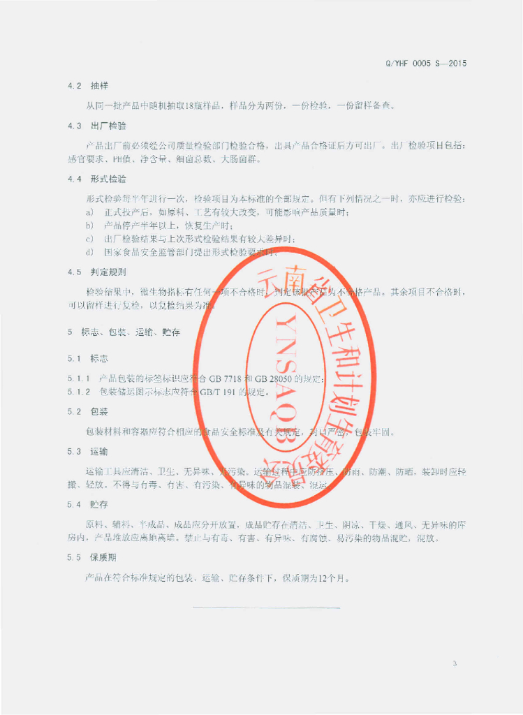 Q/YHF 0005S-2015 云南恒丰食品有限公司 无汽苏打饮料