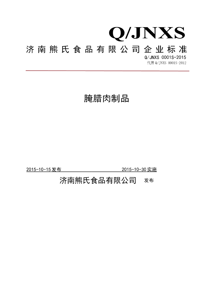 Q/JNXS 0001S-2015 济南熊氏食品有限公司 腌腊肉制品