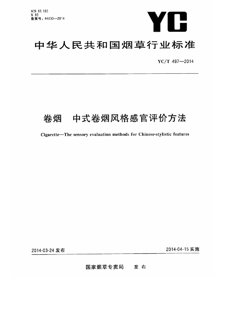 YC/T 497-2014 卷烟 中式卷烟风格感官评价方法