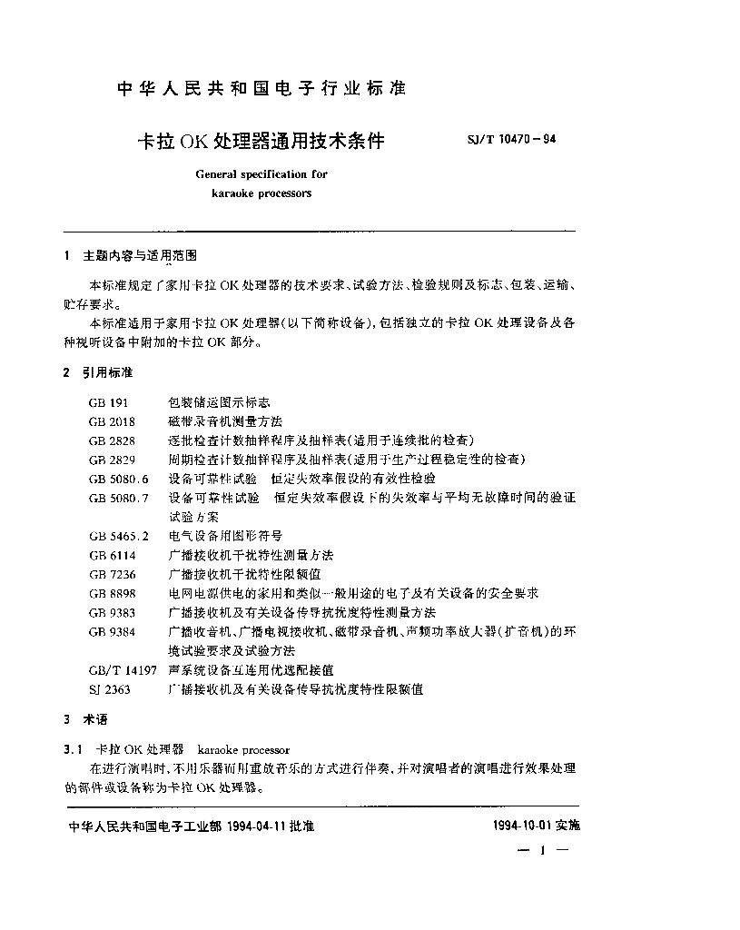 SJ/T 10470-1994 卡拉OK处理器通用技术条件