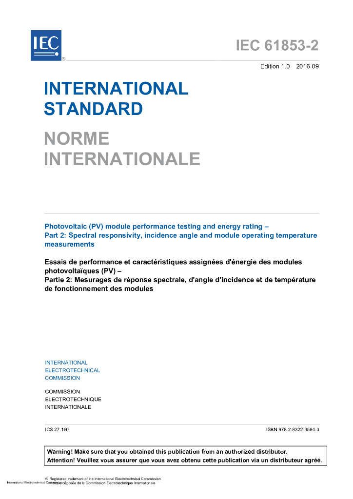 IEC 61853-2-2016 光伏(PV)模块性能测试和能量等级 第2部分:光谱响应度,入射角和模块工作温度测量