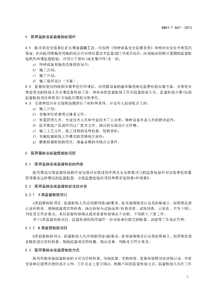 DB41/T 847-2013 医用氧舱安装监督检验规程