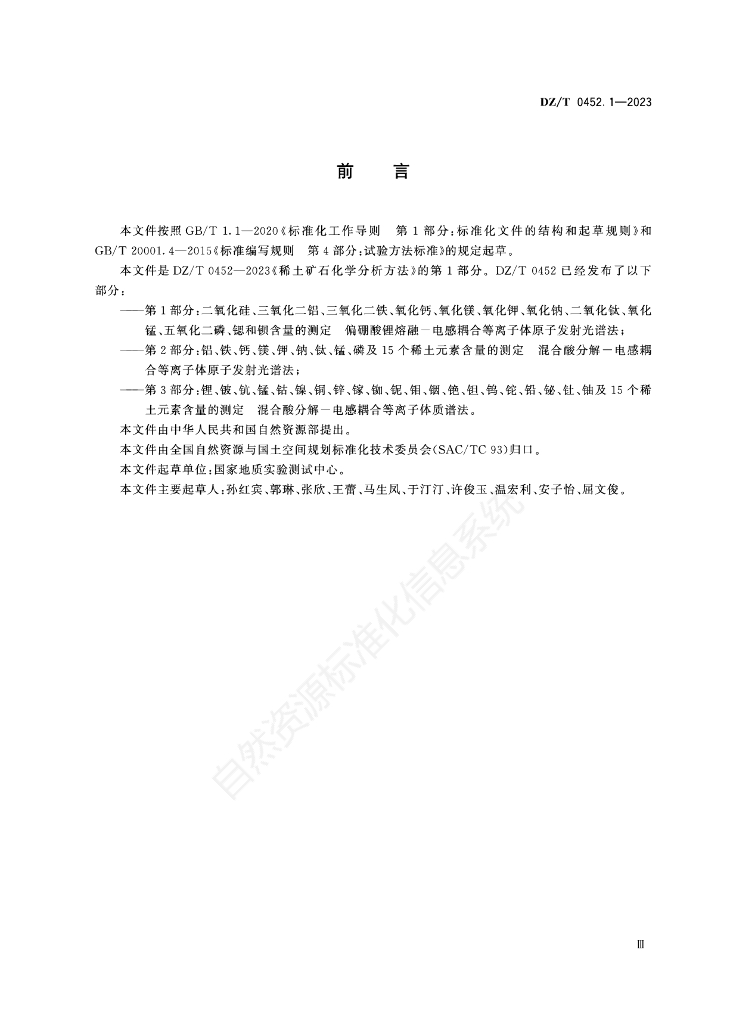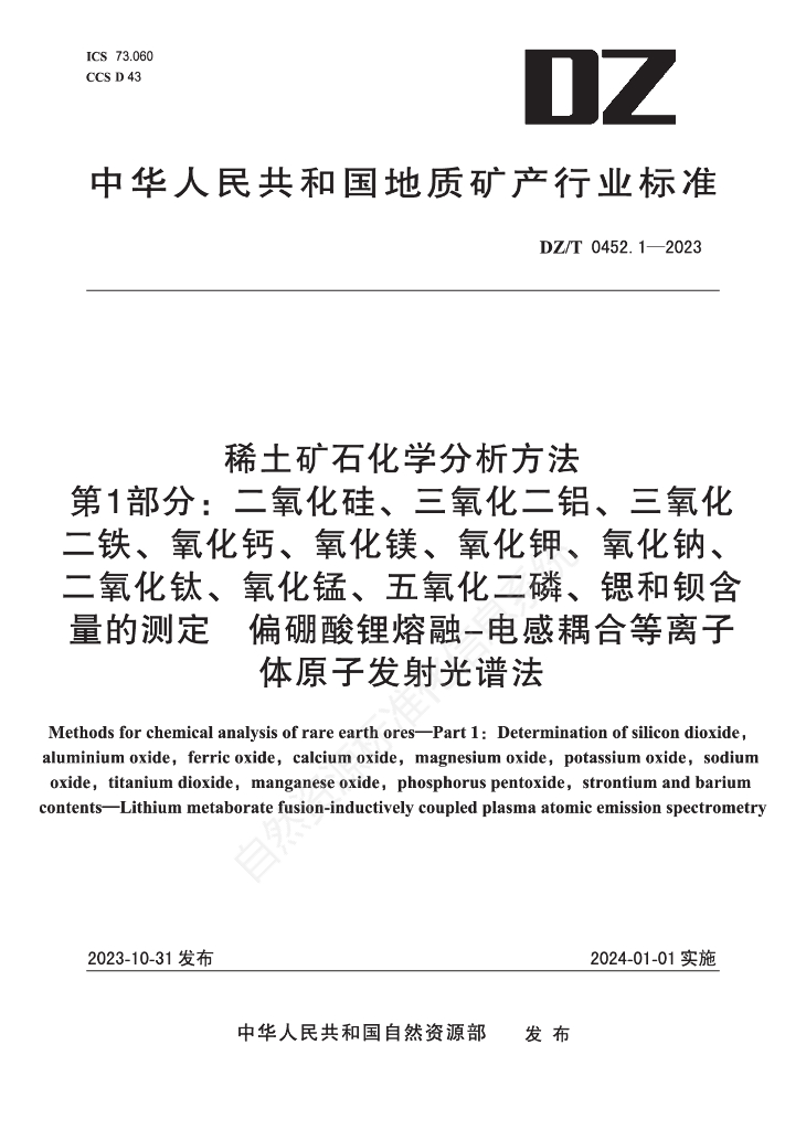 DZ/T 0452.1-2023 稀土矿石化学分析方法 第1部分:二氧化硅、三氧化二铝、三氧化二铁、氧化钙、氧化镁、氧化钾、氧化钠、二氧化钛、氧化锰、五氧化二磷、锶和钡含量的测定 偏硼酸锂熔融—电感耦合等离子体原子发射光谱法