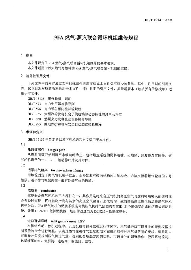 DL/T 1214-2023 9FA燃气-蒸汽联合循环机组维修规程