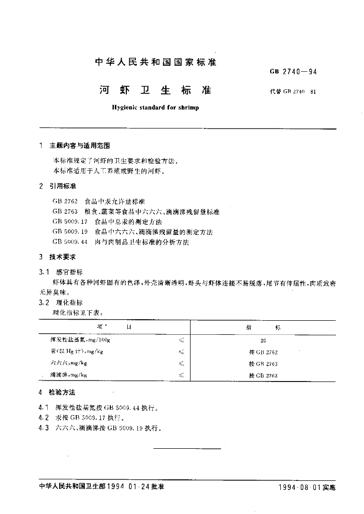 GB 2740-1994 河虾卫生标准