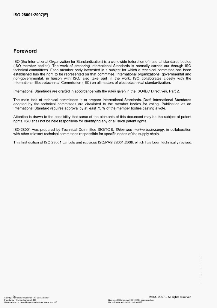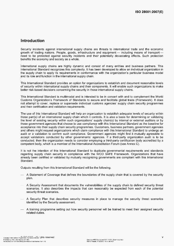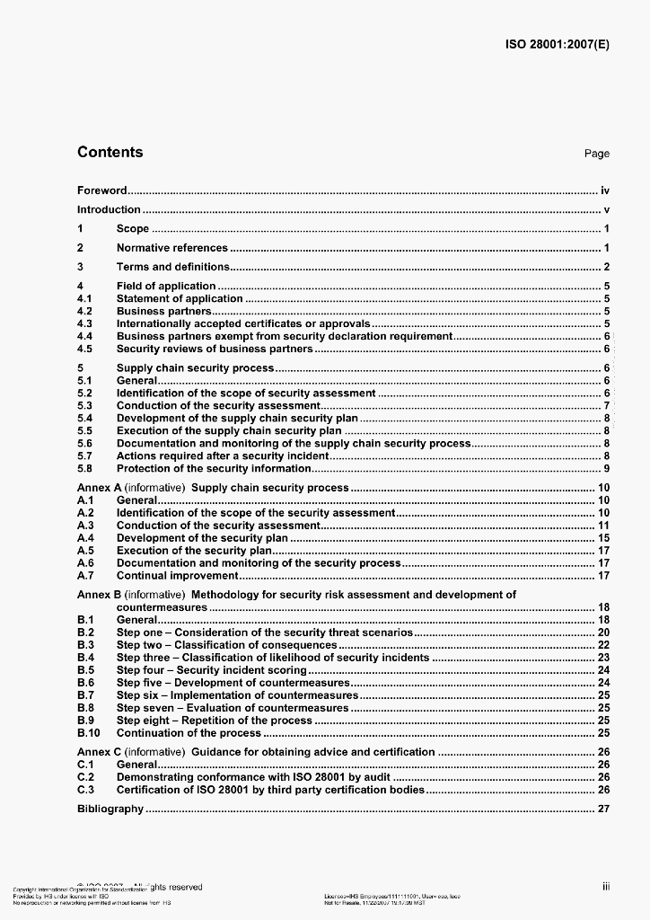 ISO 28001:2007(E) Security management systems for the supply chain–Best practices for implementing supply chain security, assessmentsand plans-Requirements and guidance