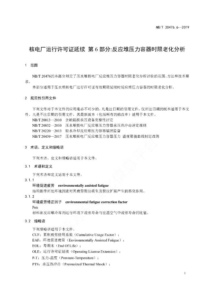 NB/T 20476.6-2019 核电厂运行许可证延续 第6部分:反应堆压力容器时限老化分析