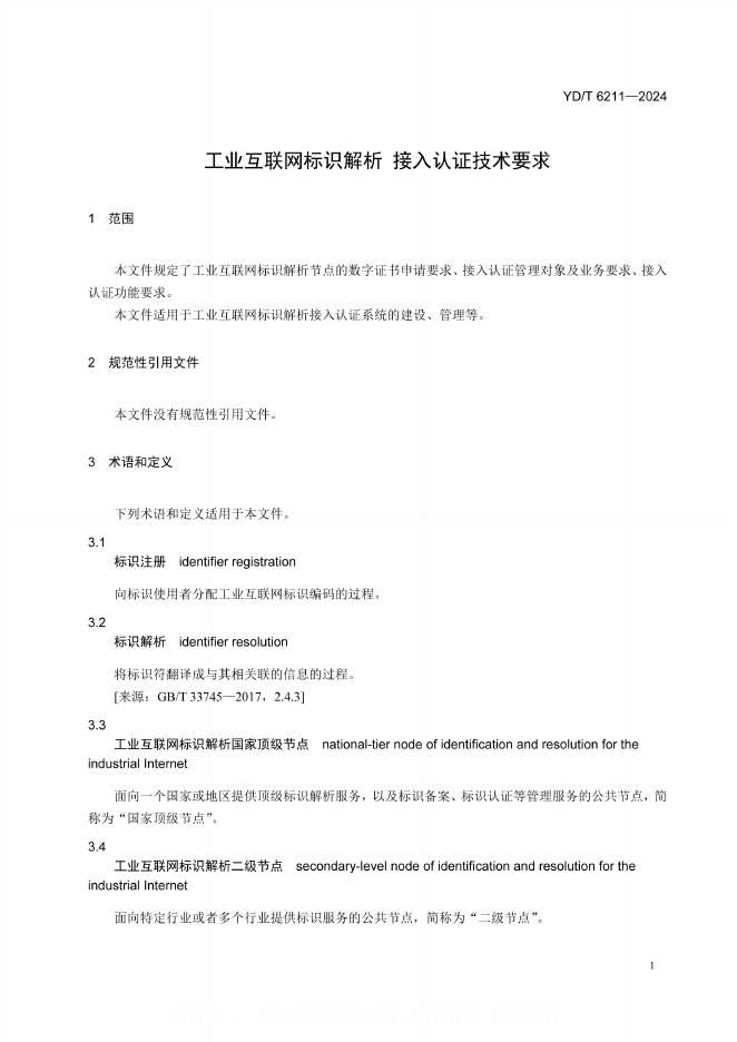 YD/T 6211-2024 工业互联网标识解析 接入认证技术要求
