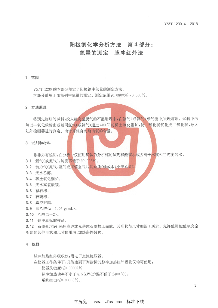 YS/T 1230.4-2018 阳极铜化学分析方法 第4部分:氧量的测定 脉冲红外法