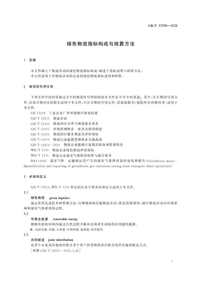 GB/T 37099-2026 绿色物流指标构成与核算方法