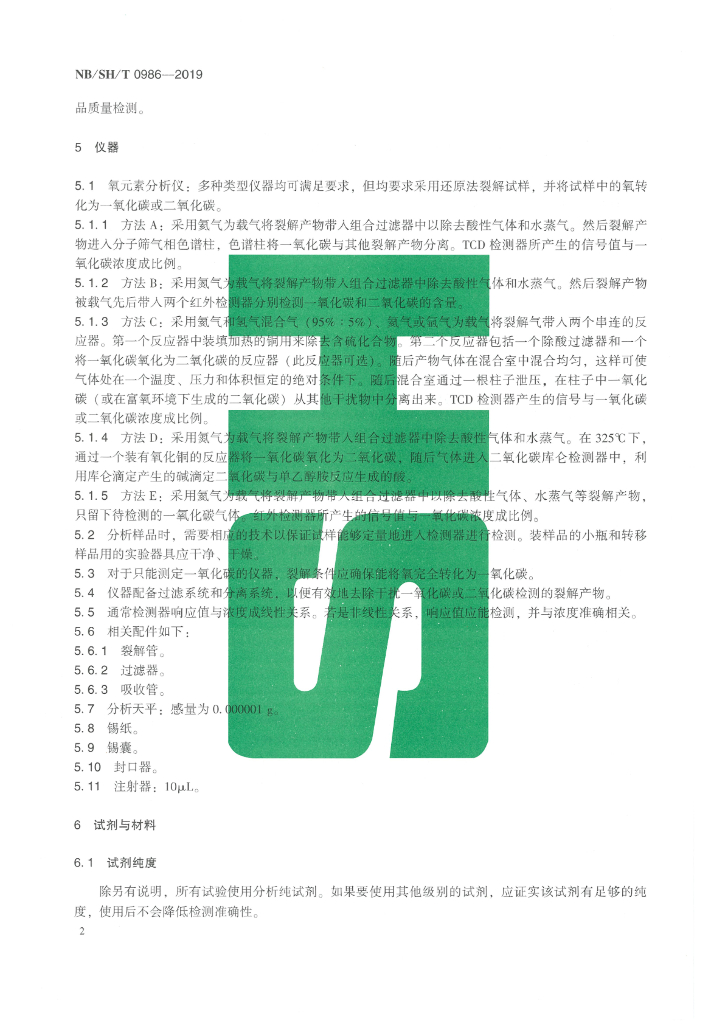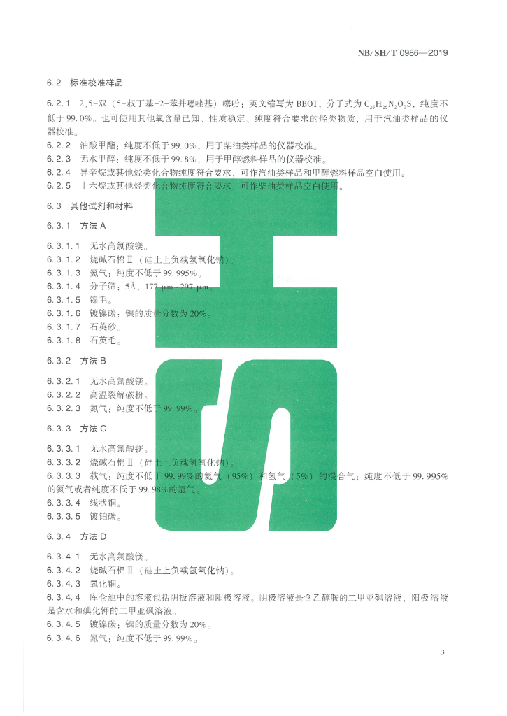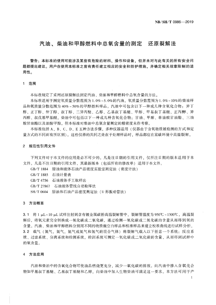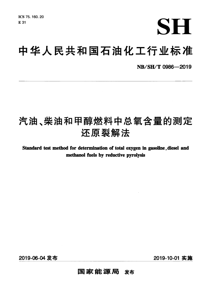 NB/SH/T 0986-2019 汽油、柴油和甲醇燃料中总氧含量的测定 还原裂解法