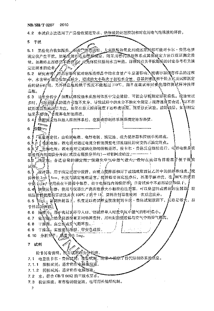 NB/SH/T 0207-2010 绝缘液中水含量的测定 卡尔·费休电量滴定法