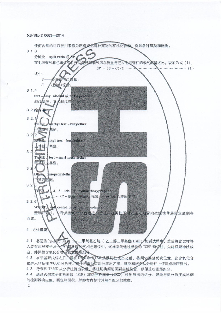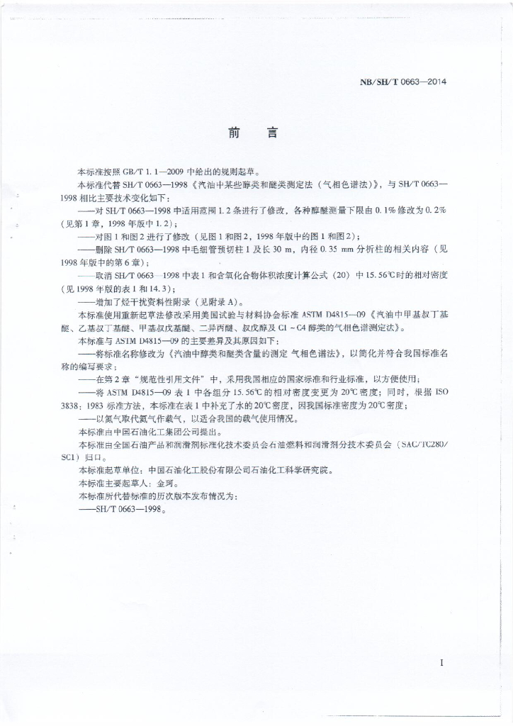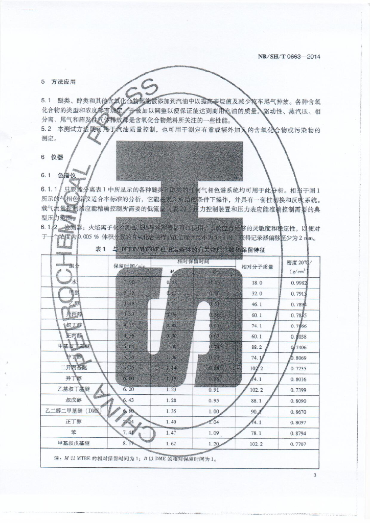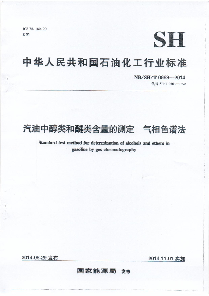 NB/SH/T 0663-2014 汽油中醇类和醚类化合物的测定 气相色谱法