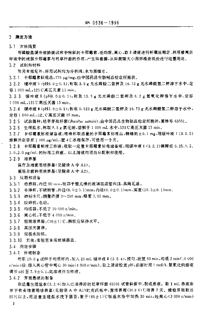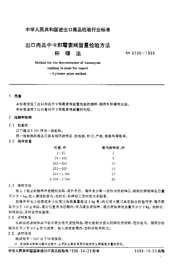SN 0536-1996 出口肉品中卡那霉素残留量检验方法 杯碟法
