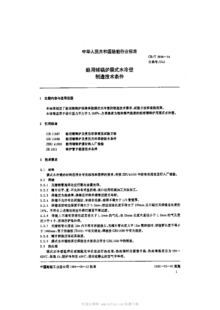 CB/T 3596-1994 船用辅锅炉膜式水冷壁制造技术条件